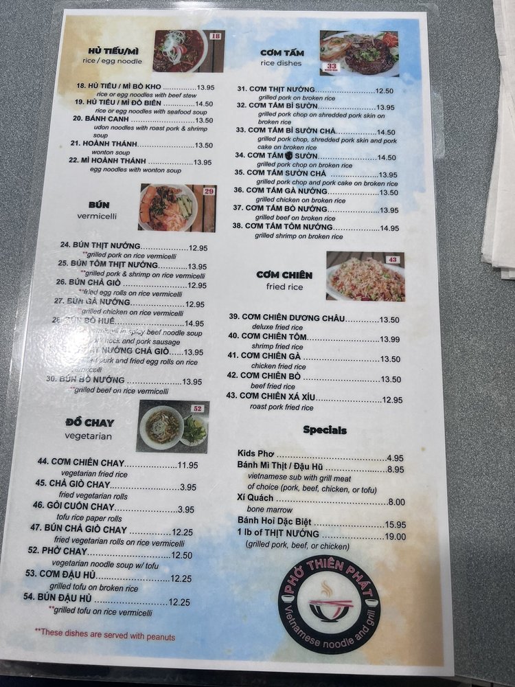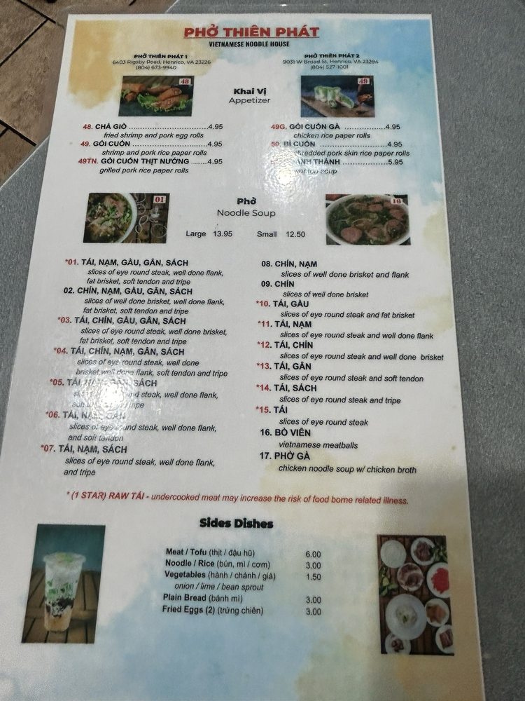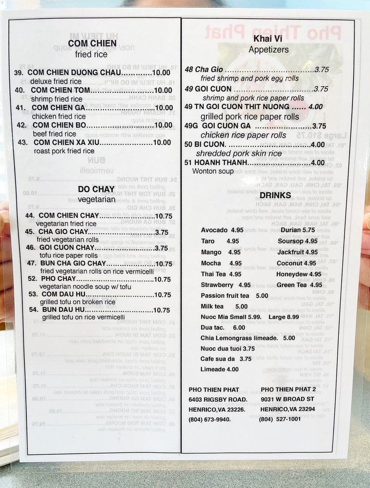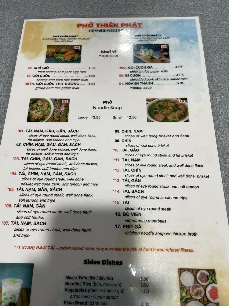 Pho Thien Phat, located in Richmond, VA, offers a wide range of Vietnamese dishes with options for delivery, takeout, and reservations. The menu includes appetizers such as Cha Gio fried shrimp and pork egg rolls, side dishes like tofu and meat options, and various pho choices like Tai, Nam, Gau, Gan, Sach Pho. With positive customer reviews praising the flavorful broth and generous meat portions, Pho Thien Phat stands out as a top choice for authentic Vietnamese cuisine in Richmond. The restaurant provides a casual dining experience, suitable for groups and families, with an array of vegan and vegetarian options. Overall, Pho Thien Phat combines traditional flavors with modern amenities, making it a must-try for pho enthusiasts and lovers of Vietnamese cuisine.